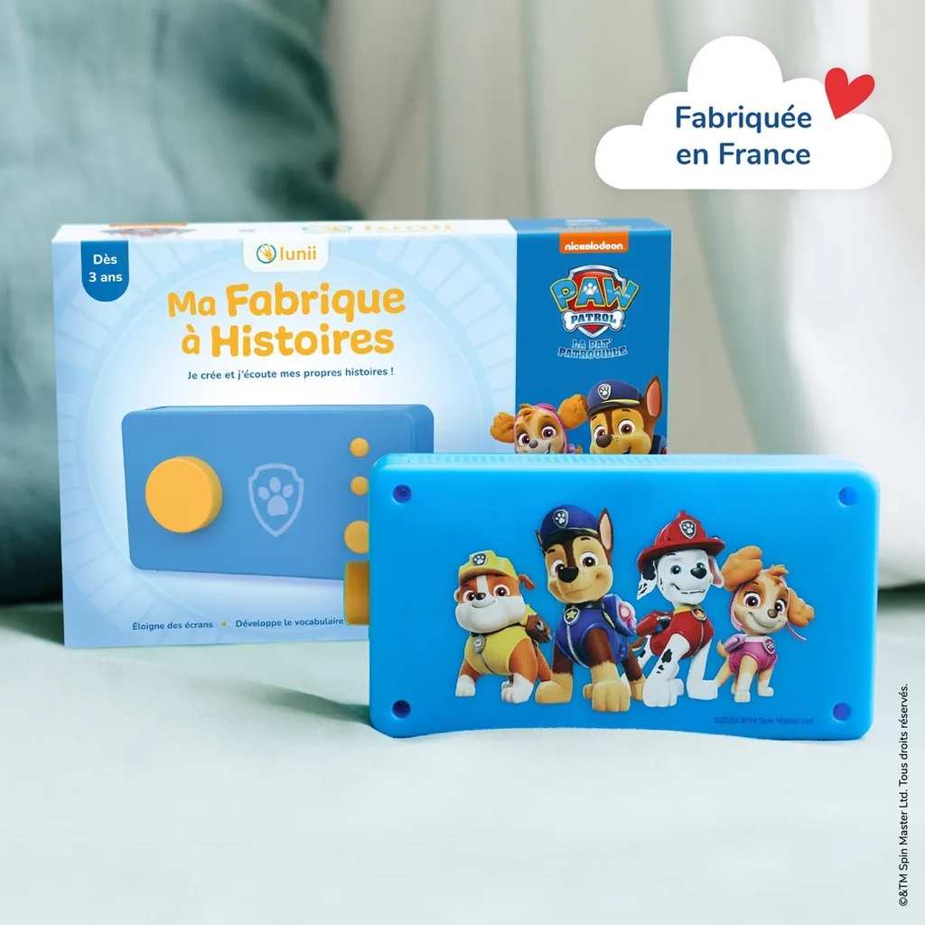 Solution: la Fabrique à Histoires Lunii Pat’ Patrouille Bleu est un boîtier audio interactif qui permet à votre enfant de personnaliser son récit. Grâce à une application dédiée, vous pouvez acheter, gérer et transférer des livres audio dans la bibliothèque du boîtier. On peut aussi enregistrer ses propres récits avec Mon Studio Lunii, puis les transférer pour une expérience encore plus personnelle. Dès 3 ans, l’enfant choisit les éléments qui composeront son histoire et écoute le résultat, seul ou en famille.
