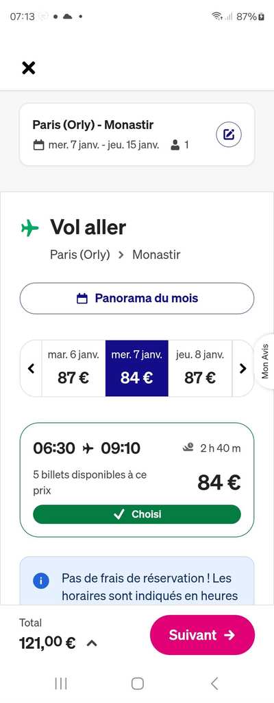 Caractéristiques clés : vol A/R Paris Orly Monastir, dates du 7 au 15 janvier, bagage cabine inclus, séjour d’une semaine, et un prix défiant toute concurrence.